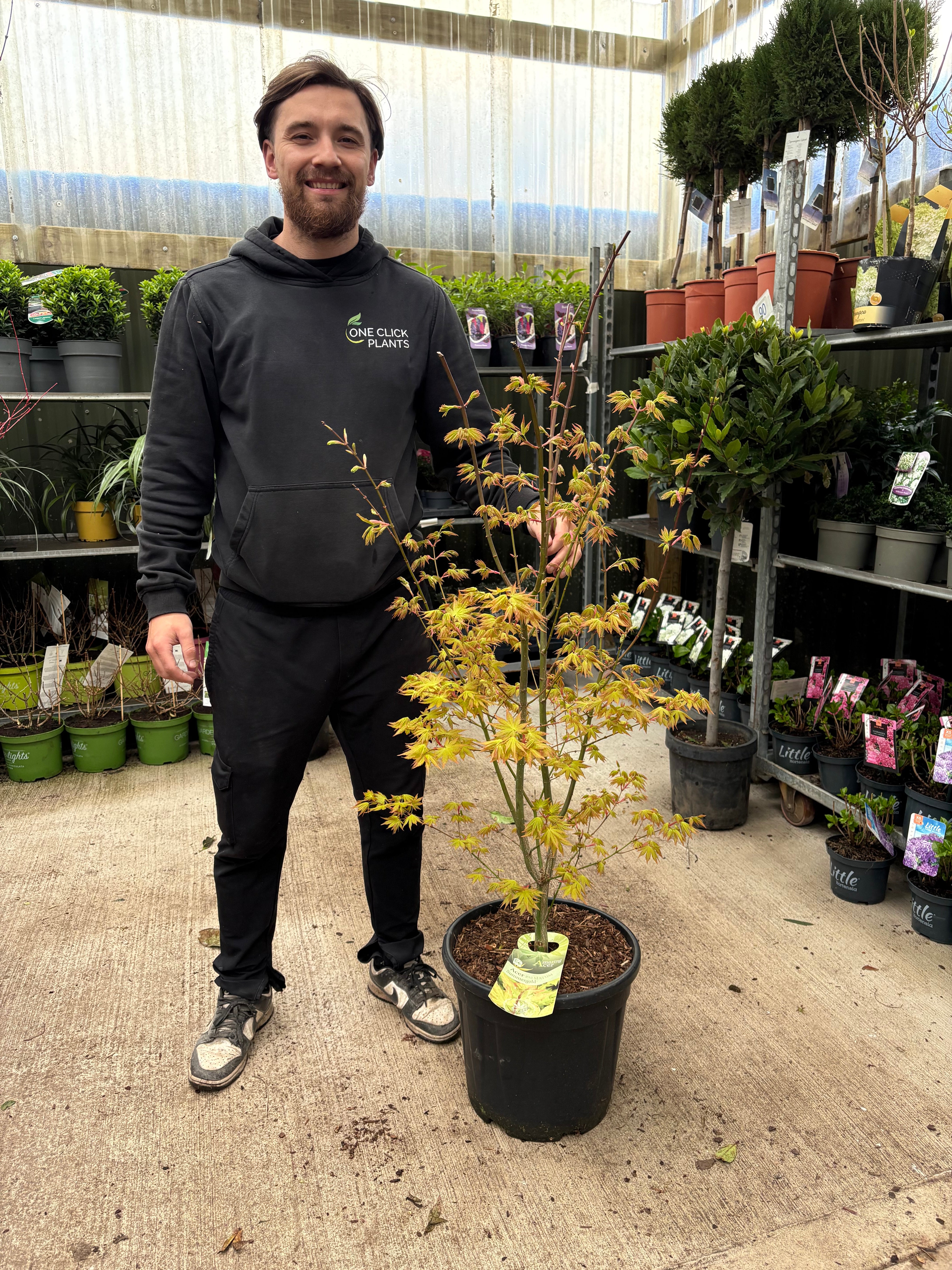 This eye catching Japanese maple produces bright golden yellow leaves that hold their colour well through the season, especially when given a little protection from strong sun. Its finely cut foliage creates a light, airy canopy, while autumn brings warm tones before leaf fall. It is perfect for adding a vibrant focal point to borders or containers in a sheltered spot.