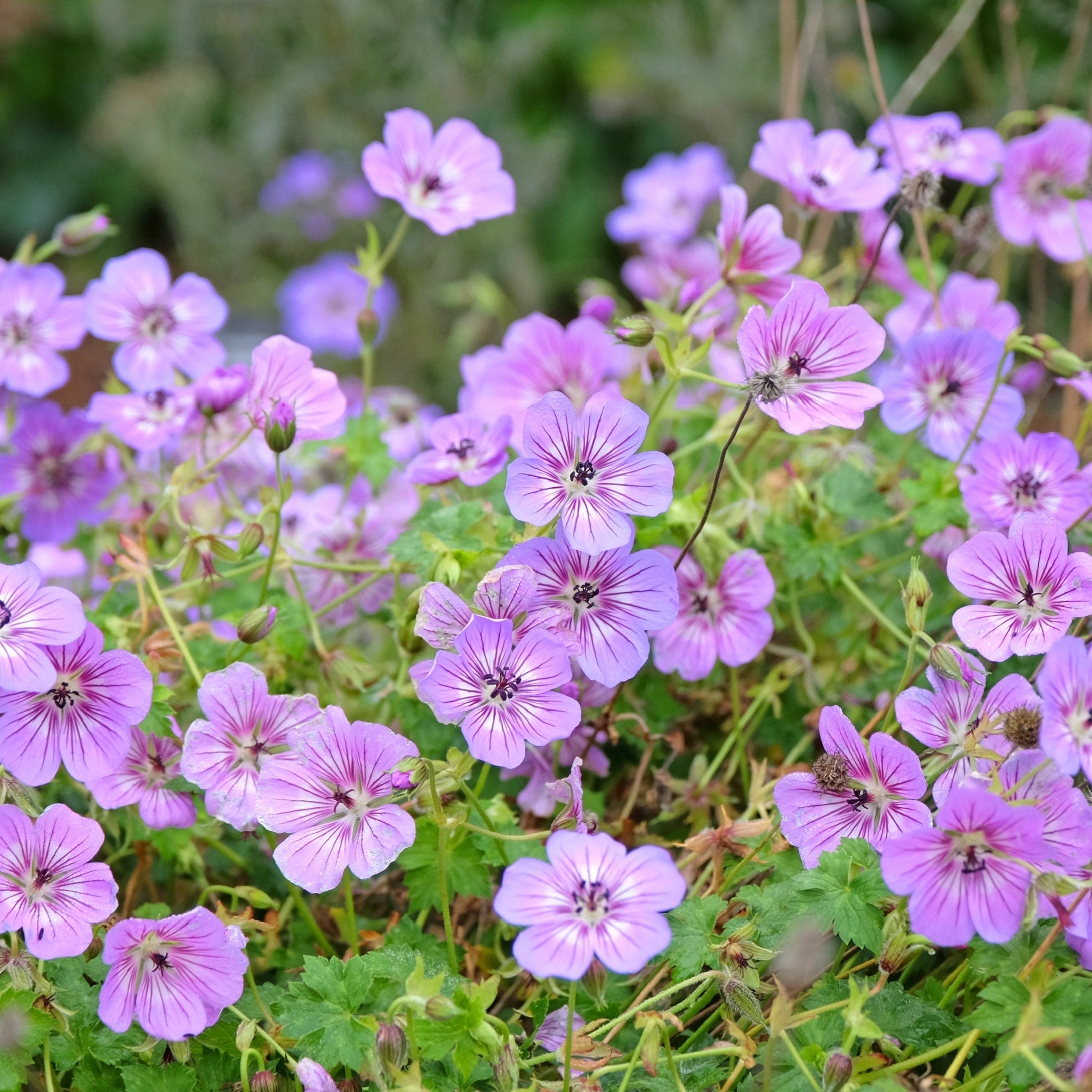 Geranium hybrida Dusky Crug is a striking perennial grown for its rich, dusky foliage and soft lavender pink flowers that appear from late spring into summer. The deeply coloured leaves create a warm contrast in borders, while the airy blooms sit above on slender stems, adding gentle movement. It is perfect for naturalistic planting, cottage gardens and mixed borders where you want foliage interest as well as seasonal colour. Dusky Crug forms a neat, spreading mound that weaves nicely between other plants without becoming intrusive.