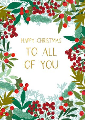A cheerful Christmas card featuring the message “Happy Christmas to All of You” on the front, and “Wishing you a very merry Christmas” inside.