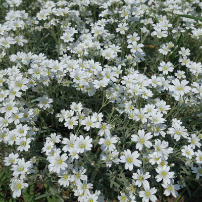 Cerastium tomentosum 'Silberteppich', also known as Silver Carpet, is a low-growing perennial that forms a dense, silvery-grey mat of soft, fuzzy foliage. In late spring to early summer, it produces an abundance of small, white, star-shaped flowers that brighten any garden with their crisp, cheerful display. Perfect for groundcover, rock gardens, or as an edging plant, this variety thrives in full sun and well-drained soil. Offering excellent drought resistance once established, Cerastium tomentosum 'Silberteppich' is easy to maintain, attracts pollinators, and adds both texture and beauty to the garden throughout the season.