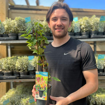 An evergreen climber which has distinctive bronze foliage which fades to green as it matures. In the early summer it begins to produce yellow flowers which provide a beautiful contrast against the foliage.