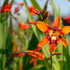 Crocosmia 'Emily Mckenzie' is a compact plant which produces bright, fiery orange flowers which have a mahogany throat.