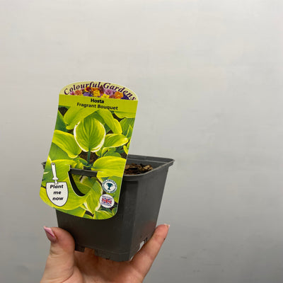 Hosta 'Fragrant Bouquet' is a stunning perennial known for its captivating fragrance and attractive foliage. It boasts large, heart-shaped leaves with a striking contrast of creamy yellow centers and dark green edges, creating a vibrant and elegant mound. This hosta reaches a height of about 45 cm with a spread of up to 60 cm, making it an excellent choice for borders, woodland gardens, or shaded areas.