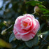 Camellia japonica 'Kick off' produces a mass of soft pink flowers with dark pink streaks. The beautiful blooms really stand out against the contrasting dark green foliage. .