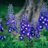 Delphinium elatum 'Guardian Blue' is a towering perennial known for its striking, rich blue flowers with a delicate white centre. These vibrant blooms are held on tall, sturdy spikes above a base of deeply lobed green foliage, creating a bold vertical statement in the garden. Blooming in mid to late summer, 'Guardian Blue' thrives in full sun and well-drained soil, and benefits from staking to support its height. This variety is perfect for borders, cottage gardens, or as a dramatic focal point in larger landscapes. Attractive to pollinators, Delphinium 'Guardian Blue' is also an excellent cut flower, bringing timeless beauty to both gardens and floral arrangements.