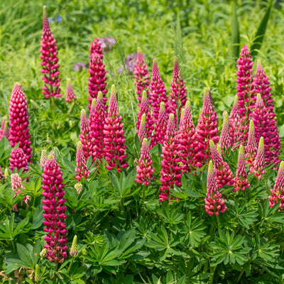 Lupinus polyphyllus 'Legendary Red' is a stunning perennial that adds a bold splash of color to the garden with its striking red flower spikes. The upright clusters of tubular flowers, which are a deep, rich red, rise above deeply lobed, green foliage, creating a dramatic vertical display in late spring to early summer. This variety is perfect for adding height and color to borders, cottage gardens, or mixed plantings. 'Legendary Red' thrives in full sun and well-drained soil, and once established, it is drought-tolerant. Its long-lasting blooms attract bees and butterflies, and its striking color also makes it ideal for cutting and displaying in floral arrangements. A perfect addition to any garden, providing both beauty and pollinator interest.