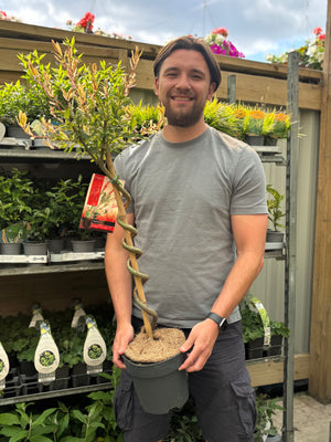 Grafted onto a standard stem with a carefully trained spiral trunk, it brings an elegant architectural twist to patios, borders, and smaller outdoor spaces. The tree’s compact, rounded head is easy to maintain and responds well to regular pruning, keeping its shape neat and vibrant year after year.
