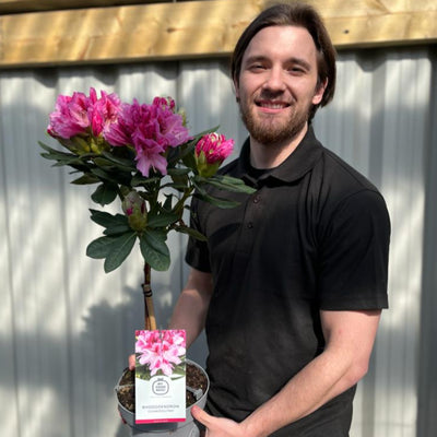 This Rhododendron will make a striking focal point in your spring garden! This evergreen Rhododendron forms a dense head of vibrant pink blooms above a clear, single stem.