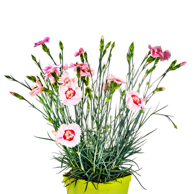 Dianthus x allwoodii 'Tequila Sunrise' is a vibrant perennial that features striking, orange and yellow bicoloured flowers with delicately frilled edges and a subtle, spicy fragrance. The blooms are held on sturdy stems above a mound of grey-green foliage, creating a bold contrast in the garden. Flowering from late spring to early summer, 'Tequila Sunrise' thrives in full sun and well-drained soil, making it an ideal choice for borders, containers, or rock gardens. This variety is drought-tolerant once established and attracts pollinators, bringing both colour and fragrance to your garden. With its compact growth and long-lasting blooms, Dianthus 'Tequila Sunrise' is perfect for adding a bright and cheerful touch to any sunny garden space.