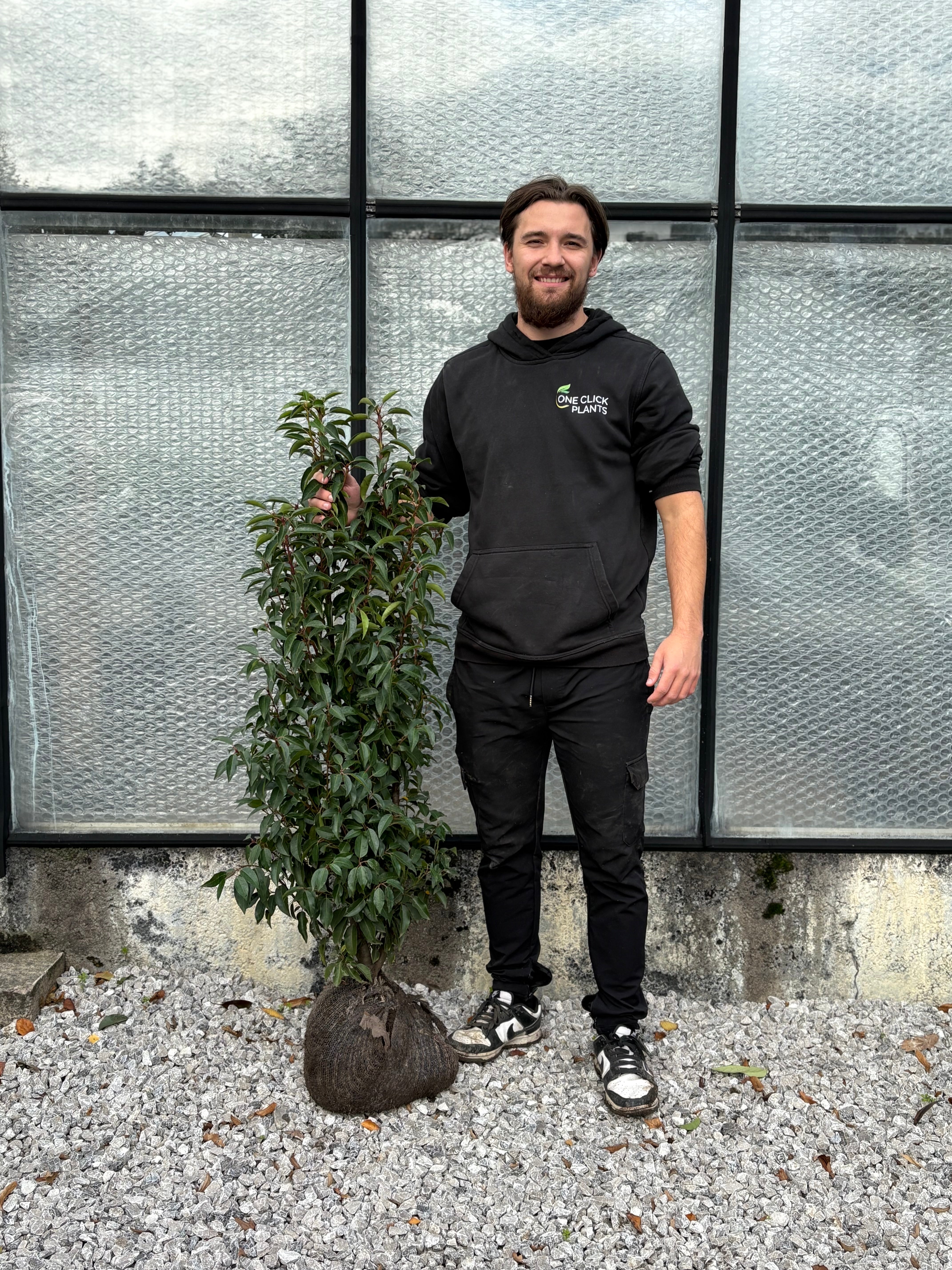 Portuguese Laurel (Prunus lusitanica) is one of the best choices for creating a smart, dense, and long-lasting evergreen hedge. With its glossy dark green leaves, reddish stems, and compact growth, it provides excellent year-round cover and privacy. In summer, clusters of fragrant white flowers appear, followed by small red berries that ripen to black, adding seasonal interest for both people and wildlife.