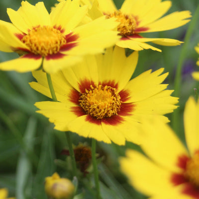 Coreopsis 'Sunkiss' has bright yellow flowers with a large central Burgundy blotch. This plant has a long flowering period and is ideal planted in containers or in a sunny garden border. The blooms are attractive to pollinators.
