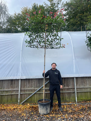 Photinia ‘Red Robin’ Pleached Trees are a striking and practical way to create above-fence privacy. Trained on a clear stem with a neat head of foliage, they form a living screen that adds both seclusion and vibrant colour to the garden.
