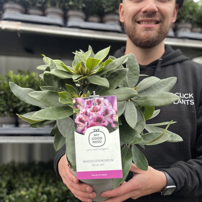 Rhododendron ‘Blue Jay’ is a striking evergreen shrub, celebrated for its masses of soft lilac-blue flowers that bloom in late spring. Each blossom has a delicate hint of purple with a darker speckled throat, creating an elegant contrast against the plant’s deep green, glossy foliage. Compact and free-flowering, this variety is ideal for borders, woodland gardens, or containers, where it adds year-round structure and seasonal colour.
