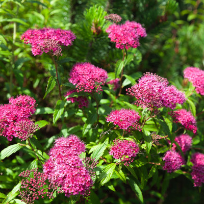 Spiraea Double Play 'Artist' is a compact, deciduous shrub prized for its vibrant foliage and long-lasting flowers. This variety is part of the Double Play series, known for its multi-season interest and ease of maintenance. In spring, fresh new leaves emerge in a striking burgundy hue before maturing to deep green. The plant produces a stunning display of magenta-pink flower clusters from late spring to mid-summer, attracting bees and butterflies. As autumn arrives, the foliage transitions to warm golden tones, adding further seasonal appeal.